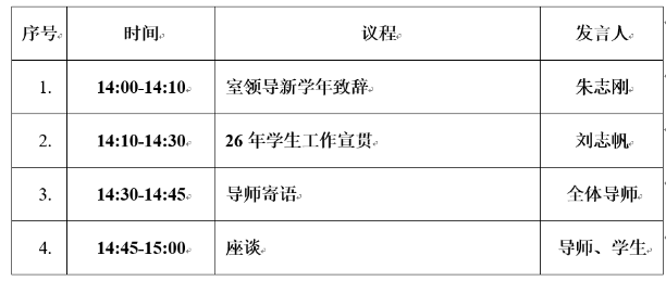 26年新学期已开始,本年度研究室学生工作任务繁多,为开创良好的开端,拟定于2026年3月5日(周四)举行本室2026年春季开学研究生工作会议,烦请准时参加!具体事项安排如下: