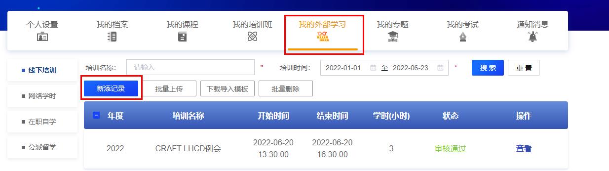 2、个人出差参加会议或培训,按1天8学时或半天4学时计算。登录继续教育网自行录入学时,点击“我的外部学习”-“新添记录”(见下图)。