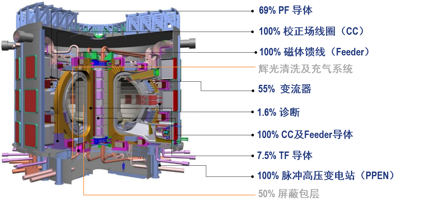 修正了原ITER电源、超导馈线等重大系统和部件的不合理设计,以新的设计方法以及经过实验验证的技术,证明了中国设计的正确性与合理性,彻底消除ITER未来运行风险,为国家争取了大量的ITER份额。研制出世界最大电流的高温超导电流引线,创下了高温超导电流引线载流能力的世界最高记录,实现了我国在高温超导大电流引线领域应用零的突破。研制的大电流超导铠装导体一次性通过严格苛刻的国际验证,性能居ITER各方之首,并率先交付ITER采购包首件产品,促使我国大型超导导体研制和工业化生产能力跨入国际领先水平。完成聚变特种电源所有关键技术的研发,研制出世界上首台一体化化设计非同相逆并联四象限变流系统样机,建成国内最大功率的直流测试平台。解决了超导磁体、超导馈线、校正场线圈、内部线圈等多项重大工程技术瓶颈,承担了相关采购包的全部任务。