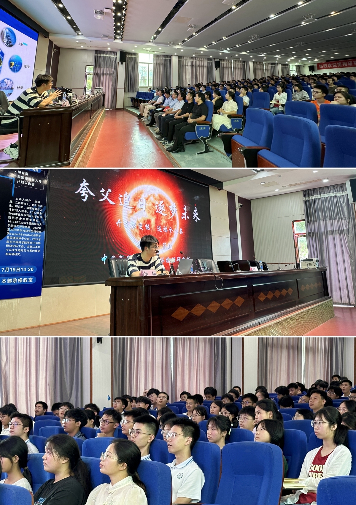 在江西省示范高级中学芦溪中学,简翔研究员应邀作了“夸父追日逐梦未来”的科普报告,吸引了线上线下1000余名高三学生和高一学生参加报告会。简翔从什么是核聚变、核聚变研究意义、等离子体所五十年从事聚变研究的精神传承,建设运行几代托卡马克装置、承担国家大科学工程、开展以我为主的国际交流合作等方面作了详细介绍。中国聚变团队致力于推动抢占科技制高点,为人类能源梦想不懈努力,激发了学生们的爱国情怀。报告风趣幽默、深入浅出,讲座结束后,提问环节学生积极参与,会场情绪高涨。