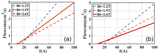 图2 双电磁泵(a)和单电磁泵(b)条件下锂的流量与电磁泵电流的关系