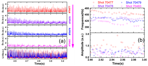 图3 流动液态锂壁条件下ELM行为变化:随着放电的持续ELM逐渐缓解(a),ELM的频率与幅值(b)