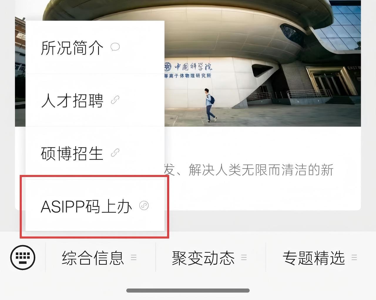 入口1:进入“中国科学院合肥研究院等离子体所”公众号私信界面,打开菜单,点击【综合信息】-【ASIPP码上办】即可跳转小程序。