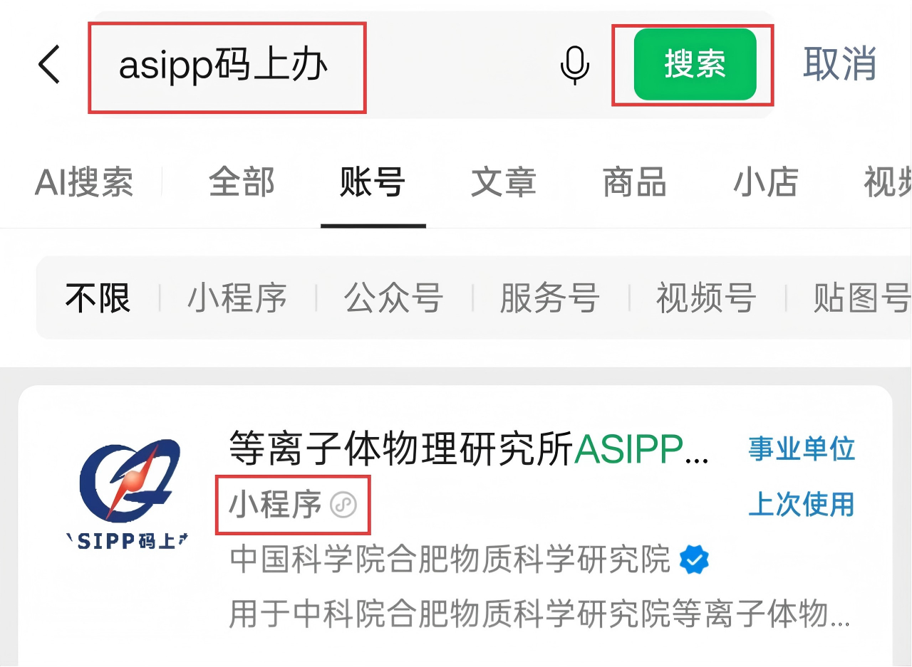 入口2:微信顶端搜索框搜索“ASIPP码上办”,选择“小程序”进入。