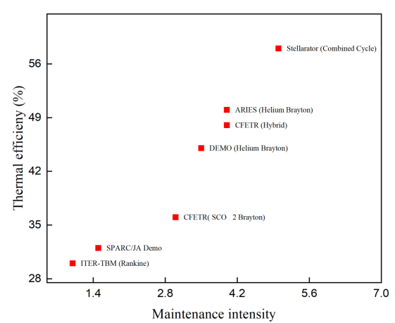 研究指出聚变反应堆部件与动力循环之间的温度失配会导致显著㶲损并降低整体效率,从而降低整体发电效率。为此,团队综合借鉴了ITER、DEMO、CFETR、STEP、EAST、SPARC、Wendelstein 7X、KSTAR等国内外主要聚变装置托卡马克、仿星器装置的设计与运行经验,旨在弥合概念设计与实际实验及长脉冲运行实践之间的鸿沟。研究展望了未来重点研究方向,包括布雷顿-朗肯/有机朗肯混合架构、多温区热源的梯级利用、先进工质开发,以及基于数字建模与机器学习的系统优化方法,以期显著提升未来稳态聚变反应堆的热效率与运行可靠性。