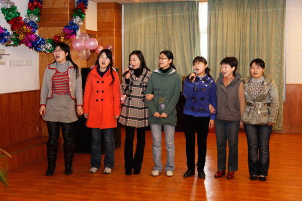 在姐妹们热烈的掌声中,“卡拉OK大家唱——想唱就唱,我最闪亮”开始了。随着优美的音乐,十一室的姐妹们手拉手唱响了《隐形的翅膀》;紧接着众姐妹踊跃登台,放声歌唱;具有歌唱特长的邬显慧、李桥生、杨玉兰等,分别为大家献上了《咏梅》、《谁不说咱家乡好》、《那片海》,她们动听的歌声搏得阵阵掌声与喝彩;三室女生许成成,青春阳光,激情四射,上台后即兴带动大家,让姐妹们前后左右相互击掌,真诚地互道一声:“您真漂亮!” 使所有在坐的姐妹们倍感幸福友爱。卡拉OK一首紧接一首,姐妹们自娱自乐过节。