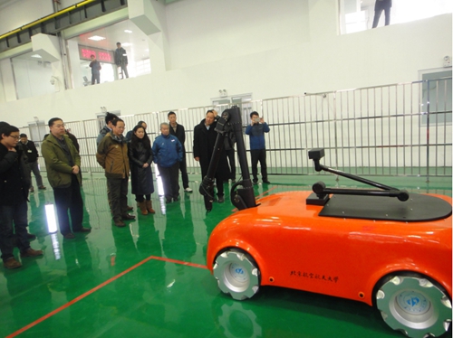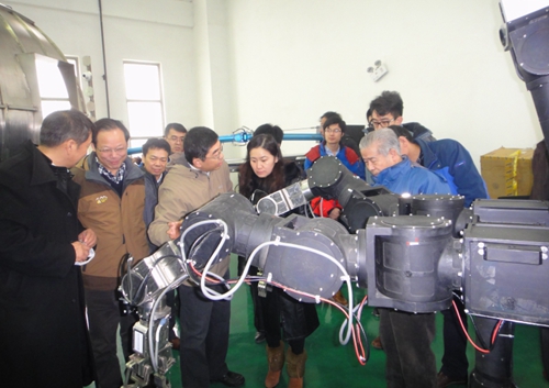 与会领导专家听取了整个遥操作实验室和测试平台的详细汇报,以及机器人系统的工作原理、可完成的任务及所能适应的工作环境的介绍。可展开式真空室内窥机器人演示了在测试平台模拟真空室内展开与巡检,该机器人系统可覆盖EAST环向180度,真空室内全部表面的扫描和巡检,可远距离粗检和近距离精检;精细遥操作主从双臂协同作业机器人系统完成了对第一壁石墨瓦的抓取;基于光纤成像的蛇形机器人在模拟真空室内完成了各关节的展开,其中耐辐照成像光纤可在核辐射环境下长时间工作;部件转运车完成对模拟窗口的精确对接,并成功将模拟的窗口插入件抓入车厢;巡检救援车完成了沿固定路线的运动和手动遥控的移动,并通过配置的机械臂点亮了模拟操作平台 上的电源按钮。
