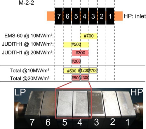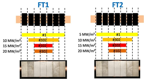 12月8日-11日,IRFM科研人员专程来所访问报告了相关结果。其中W/Cu穿管(Monoblock)模块(图1)的4号W块承受住了1200次10MW/m2和300次20MW/m2热负荷辐照;5号W块承受住了500次10MW/m2和500次20MW/m2热负荷辐照,超出了国际热核聚变实验堆ITER对20MW/m2热负荷辐照300次的要求。另外,W/Cu平板(Flat type)模块FT1(图2左)承受住了102次10MW/m2、102次15MW/m2和302次20MW/m2热负荷辐照;平板模块FT2(图2右)承受住了302次10MW/m2、102次15MW/m2和102次20MW/m2热负荷辐照。平板模块的辐照结果远远超出了5MW/m2的ITER设计要求,刷新了W/Cu平板部件HHF试验的已知记录。相关试验证明了等离子体所W/Cu-PFC连接技术的先进性。