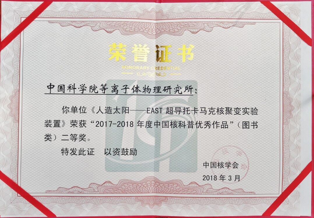 3月29日,2017—2018年度中国核科普奖颁奖晚会在北京国家会议中心举行。由等离子体所编写的科普图书《人造太阳——EAST超导托卡马克核聚变实验装置》荣获二等奖。