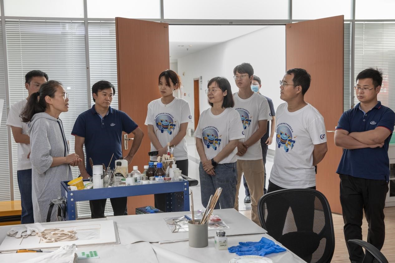 座谈交流会上,双方首先就各自单位的科普工作以及实践做法进行了分享,共同探讨双方未来在科普资源方面的合作。李家星指出,双方可以共同打造品牌科普活动,打破科普资源流动的壁垒,更好地实现资源共享,在科普信息化建设、全民科学素质提升等方面强化合作。丁飞也强调未来双方将紧密合作,打造汇聚和展示双方优质资源的科教活动,共同做好科普“加法”,助力提升公众科学素养。随后双方单位就科普活动形式创新、科普内容改革、科普团队管理等方面进行了深入探讨。在交流互动环节,来自阳光科学社的社员现场进行了低温相关的科普互动演示实验,安徽博物院也带来了一场关于八大国宝文物的精彩解说。随后大家走进安徽博物院油画保护基地,共同参观和了解油画的保护工作,对于油画修复的知识和难点也有了进一步的认识。
