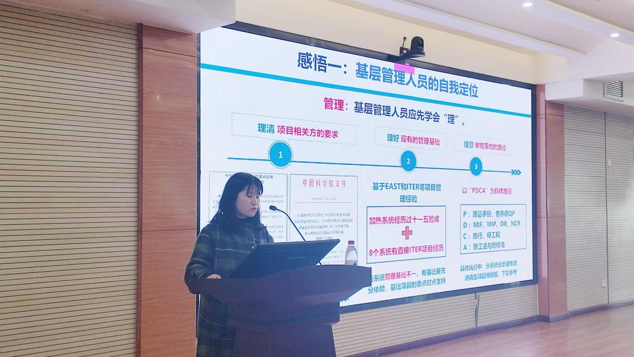 全体与会人员共同观看学习了大科学工程质量管理团队与超导直线等离子体装置课题组先进事迹相关视频,领会巾帼风采、汲取精神力量。大科学工程质量管理团队曾获“全国五一巾帼标兵岗”称号,质量管理团队代表吴皖燕结合工作实践,分享了质量管理工作的经验与心得体会。超导直线等离子体装置课题组今年荣获“中国科学院三八红旗集体”称号,课题组代表杨鑫副研究员围绕“赤霄”研制过程中的关键节点与技术挑战,讲述了课题组创新奋进的故事。座谈交流环节中与会女职工围绕科研攻关、团队建设、职业发展、权益保障、家庭生活、子女教育等话题展开热烈讨论,提出建议和意见,现场气氛活泼融洽。
